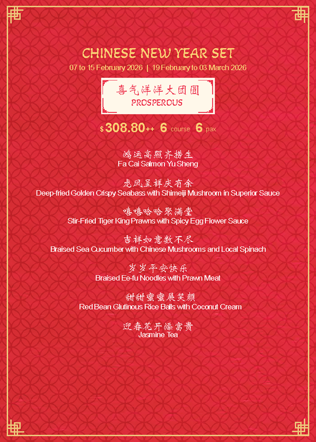 - Complimentary packaging for Reunion Dinner Menu and Chinese New Year Set Menu’s takeaway order only.